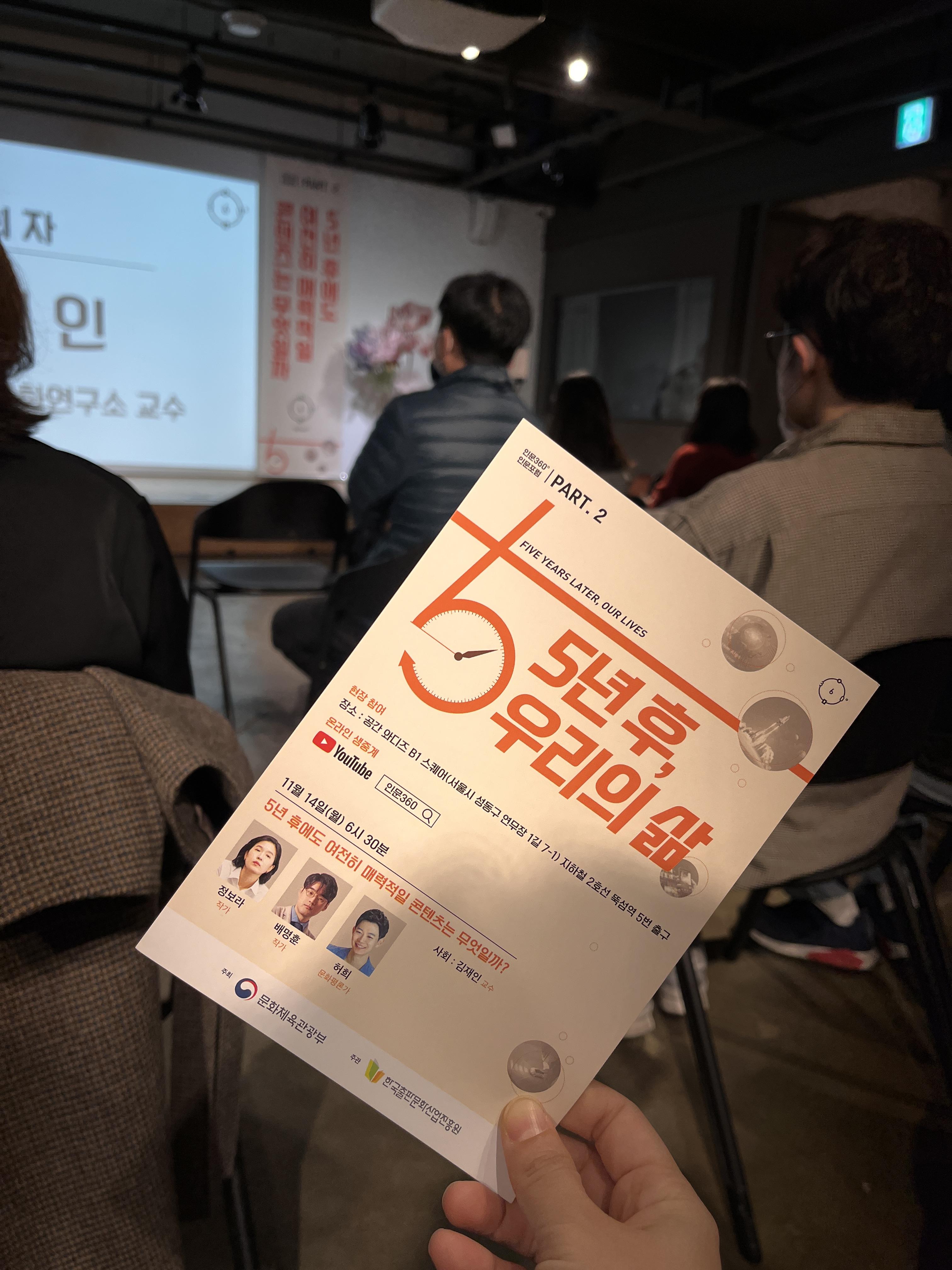 련슨배님이 강연 링크를 주면서 관심 있으면 사전 신청을 해 보라고 했다. '5년 후에도 여전히 매력적인 콘텐츠는 무엇일까?' 강연 제목이 꽤 흥미로웠기에 냉큼 신청하고 참석했는데, 강연자들도 '모르겠다'라는 답변을 너무 태연하게 해서 웃을 수밖에 없었다. 하긴 5년 전에도 내가 5년 후에 이런 삶을 살지 예상하지 못했고 이미 알았으면 뭐라도 되었겠지.